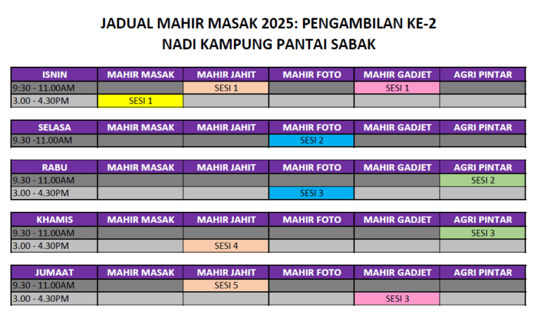 Kelas MAHIR Sesi 2 – Jadual Peserta NADI Kampung Pantai Sabak